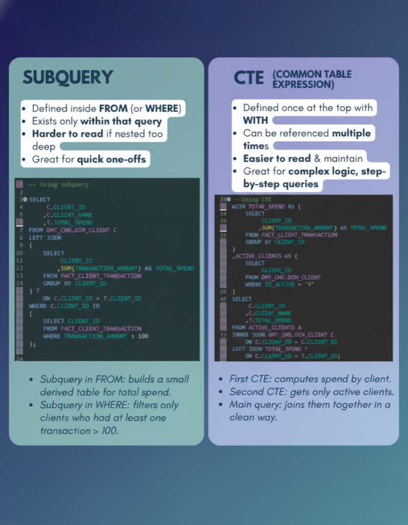 Breaking complex queries into Common Table Expressions (CTEs) improves readability and maintainability.